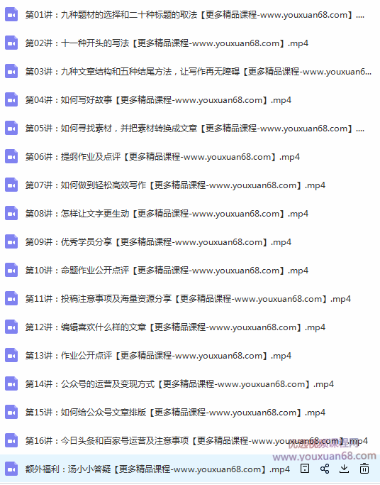 本课程是汤小小主导,从写什么到怎么写,从素材的选择到时间的管理,从如何投稿赚钱到各平台运营变现方式,从如何和编辑交往到海量资源分享,非常系统。
