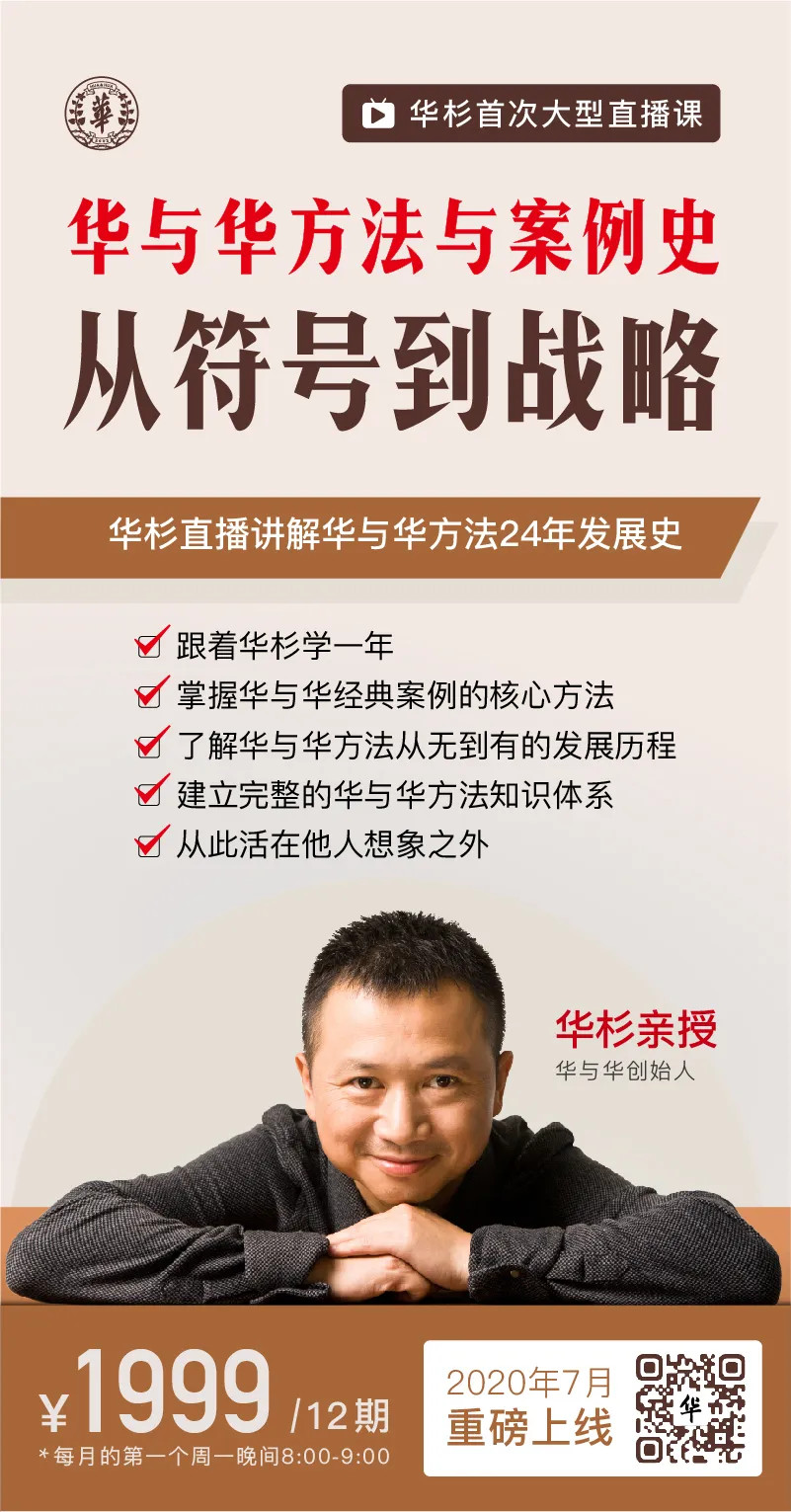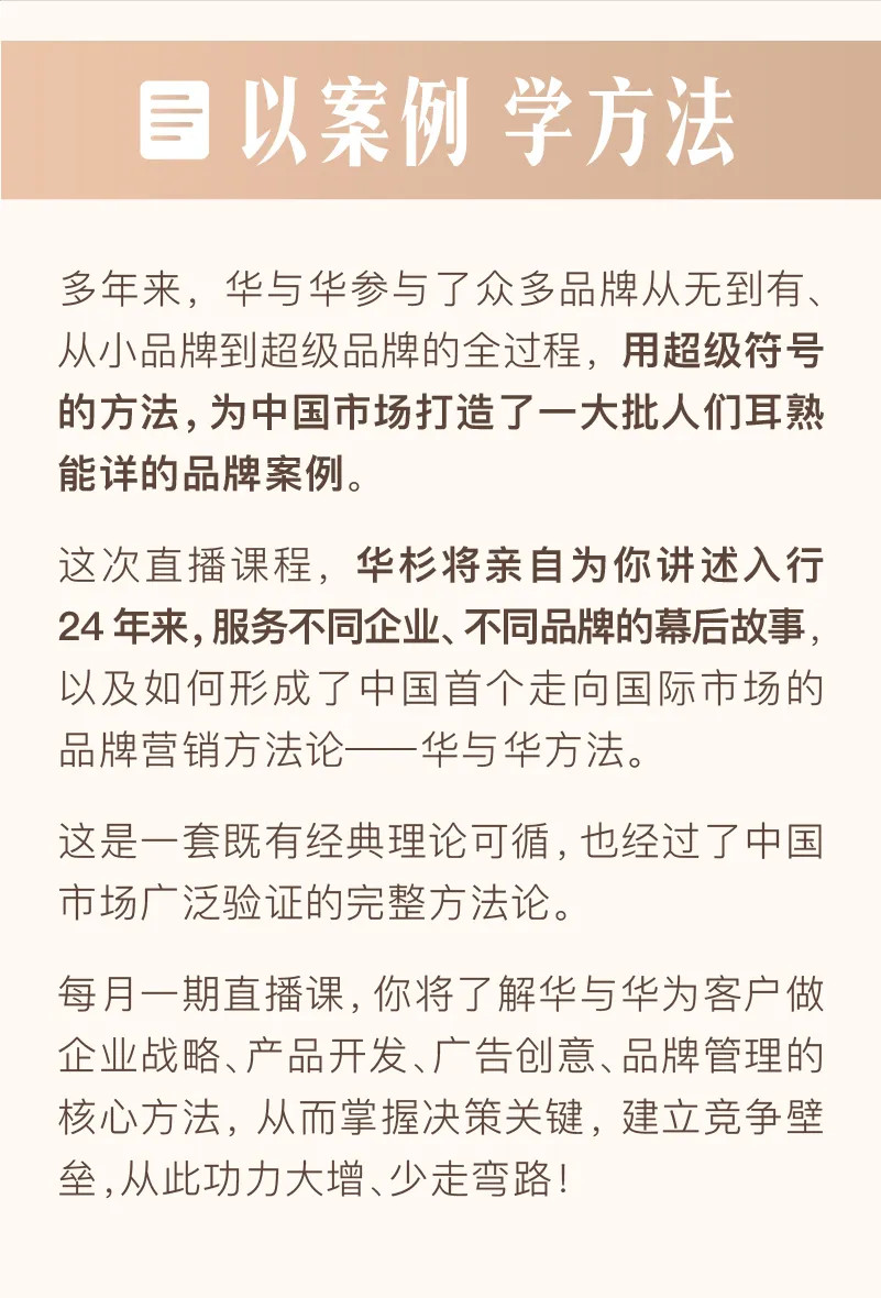 这次直播课程,华杉将亲自为你讲述入行24年来,服务不同企业、不同品牌的幕后故事,以及如何形成了中国首个走向国际市场的品牌营销方法论——华与华方法。