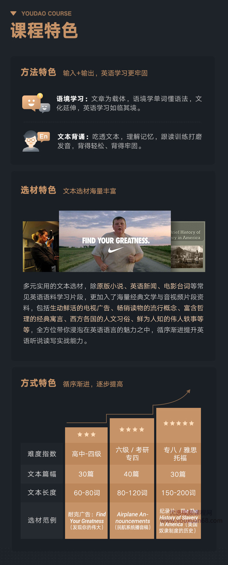 6个月深度学习,100篇精选文本,200个常见语法现象,500大实用句型与表达,6000个实用词汇,让你吃透文章,巩固词汇语法,全面提高听说读写水平,加强英语文化素养。