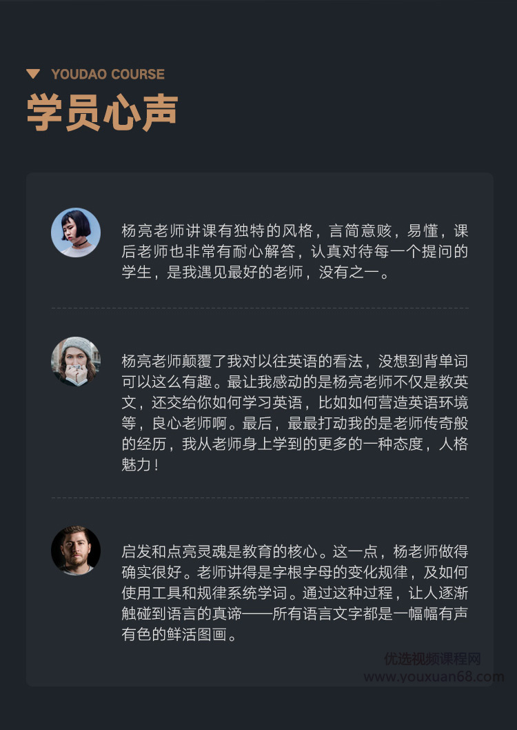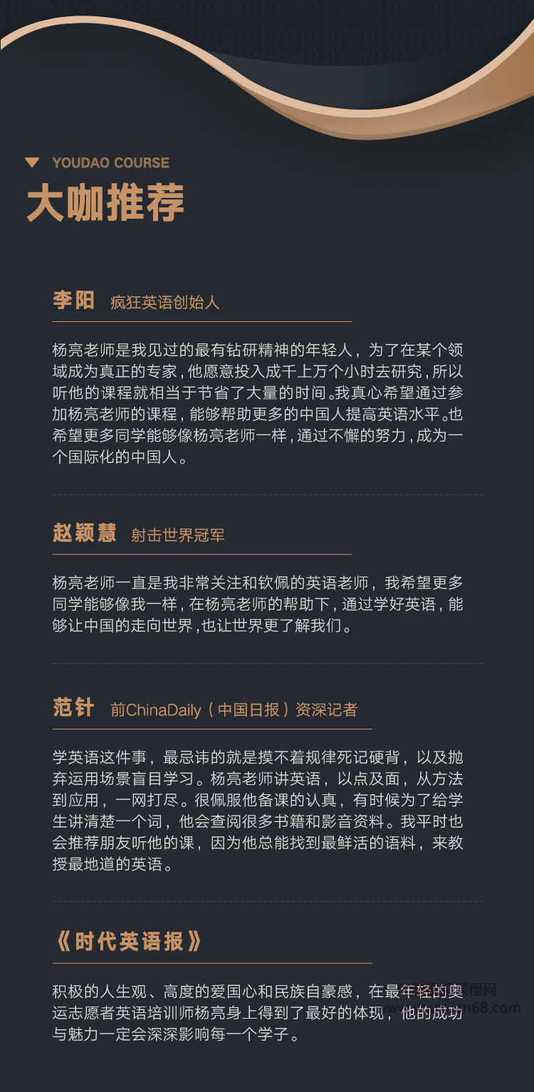 「杨亮讲英文·全民英语背诵营」重拾背诵这一经典学习法,立足于语境学习,以文章为载体,从文本精讲、单词讲解、语法解析、跟读训练、文本背诵、文化延伸六位一体。