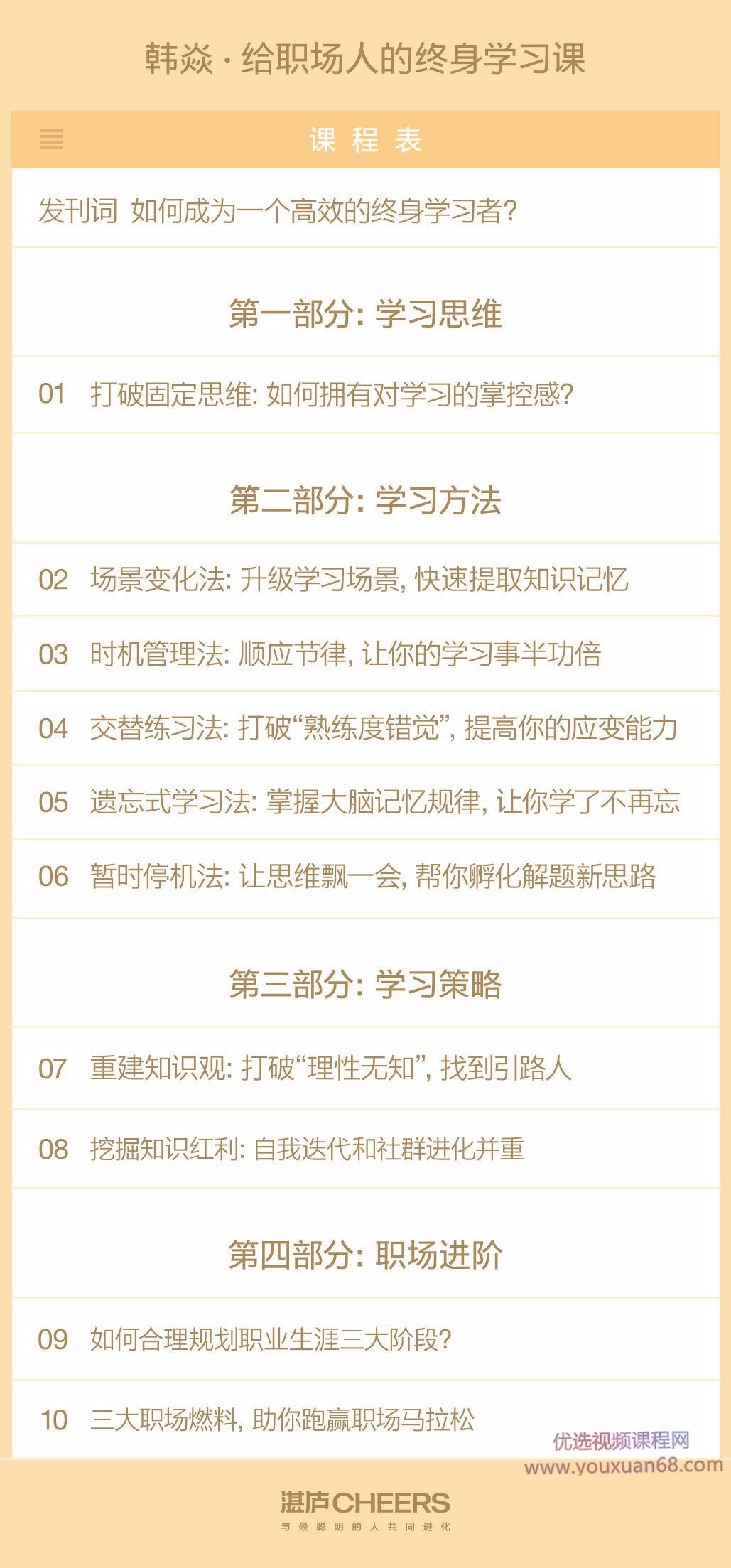 这门《给职场人的终身学习课》,将围绕“如何成为真正高效的终身学习者”最重要的四个问题,通过对学习思维、学习方法、学习策略以及职场应用四个维度全面的深度解析,并结合最新的脑科学、教育科学、认知科学、神经科学这些领域的新发现,帮你重新认识学习,学会学习,做到“知行合一”,在终身学习的道路上,进化成为“最聪明的人”!