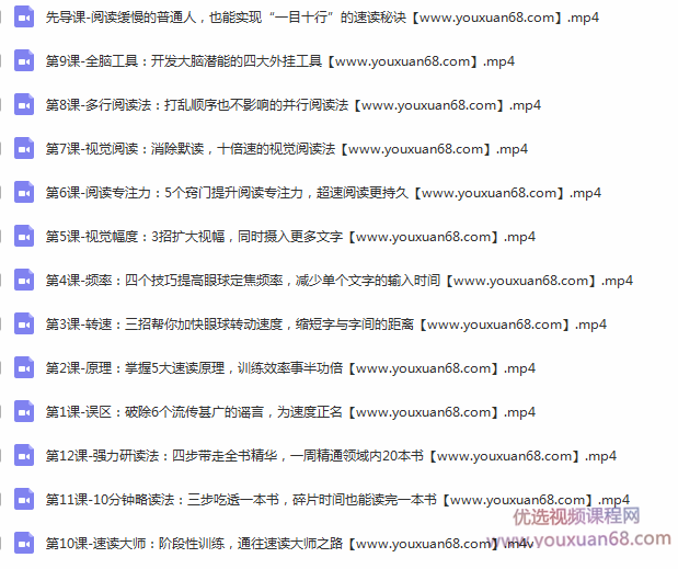 王冠(大锤)12堂快速阅读课程的目标是将我们普通人的阅读速度提高3—10倍,从而彻底摆脱效率低下的慢速阅读模式,学会快速阅读,你也能每日看完一本书。一目十行,看的快,记得牢。速读并不会降低你的理解力,相反,它是一种更高效的逐句阅读。只要你识字,你就能轻松学会快速阅读,无论你有阅读障碍、还是阅读恐惧都能在这套课程中学习到系统的快速阅读技巧
