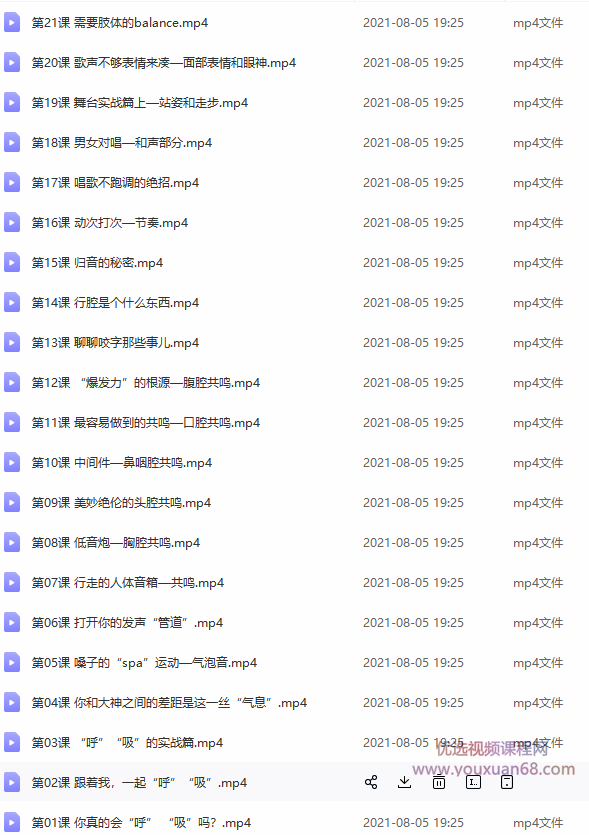 新手声乐课程,本次课程共21节课时,课程由浅入升,从基础到系统完整的讲解新手声乐的课程,无论你是小白还是有一定基础,都可以通过学习本课程提高自己声乐的能力