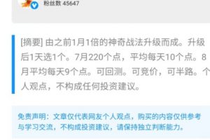 [每天10个点的无敌战法摘要]由之前1月1倍的神奇战法升级而成。升级后1天选1个。7月220个点,平均每天10个点。8月平均每天9个点。可回测。可竞价,可半路。个人观点,不构成任何投资建议。