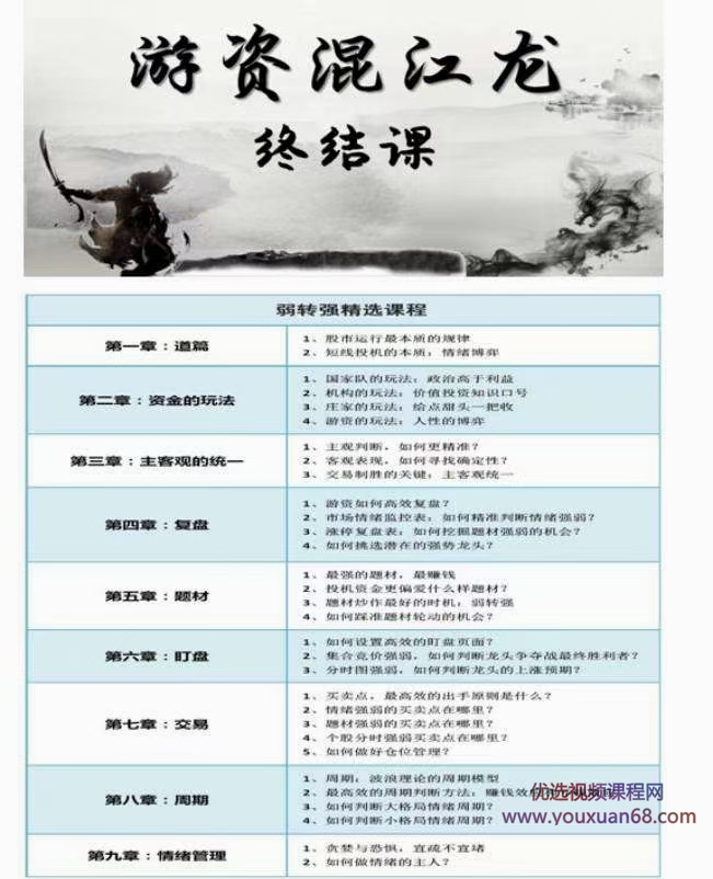 混江龙〔游资高阶班Ⅲ】终极课这次的课程,是一次总结课。我会用最精练,最通俗的语言,每一个原理,尽量都用一到两个经典案例,帮助你们理解市场,以往所有的内容,溢价,超预期,弱转强,还有未来的题材,通过这次课程,你们能够做到融会贯通。