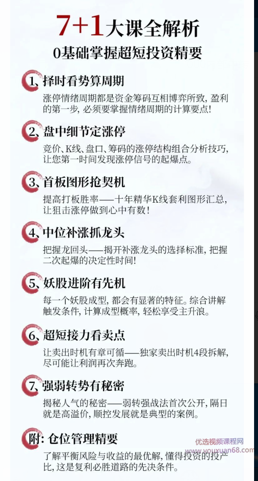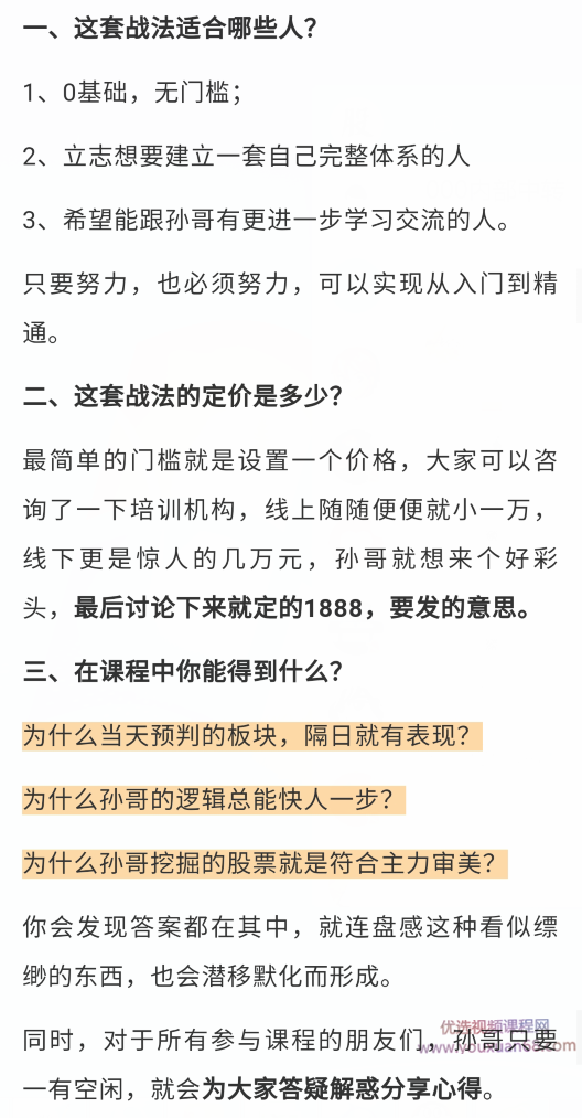 学完孙哥的课程你改变命运的机会就来了,相信孙哥虽然不会让你暴富但是会让你脱离韭菜的命运,建立游资思维和市场同步发展,这才是最重要的,超短思维才是你跑嬴市场的秘诀!!!