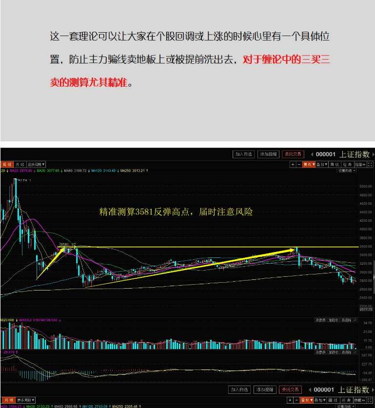 这一套理论可以让大家在个股回调或上涨的时候心里有一个具体位置,防止主力骗线卖地板上或被提前洗出去,对于缠论中的三买三卖的测算尤其精准。