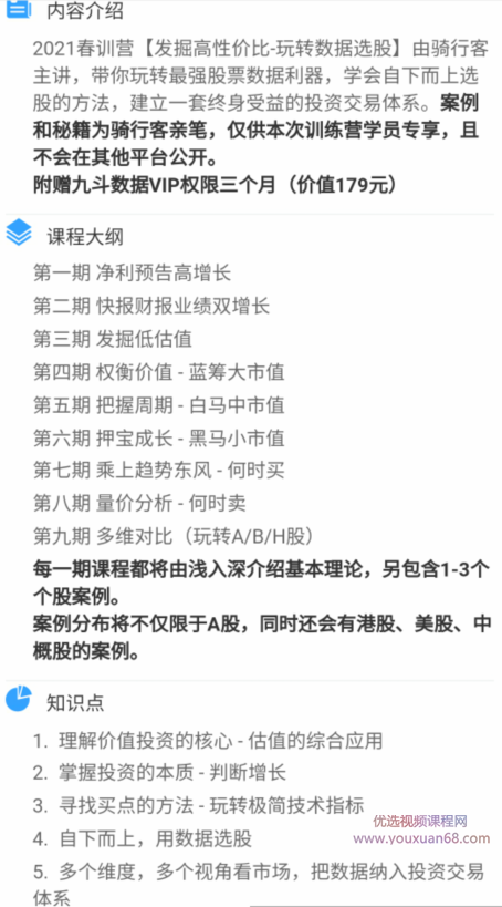 2021春训营【发掘高性价比-玩转数据选股】由骑行客主讲,带你玩转最强股票数据利器,学会自下而上选股的方法,建立—套终身受益的投资交易体系。案例和秘籍为骑行客亲笔,仅供本次训练营学员专享,且不会在其他平台公开。