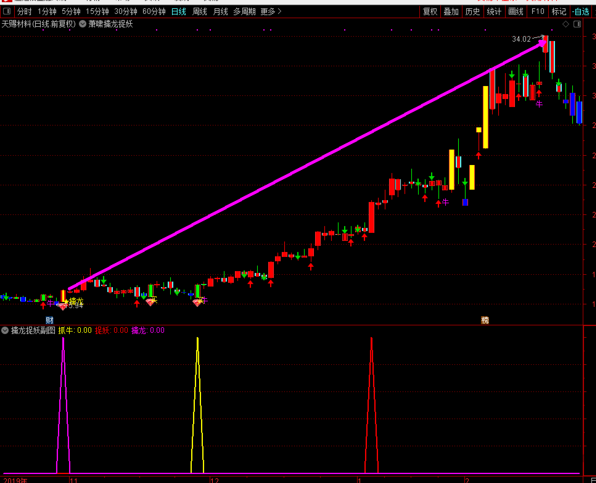 副图只有三个信号:抓牛、捉妖和擒龙,其中抓牛信号相对多一点(准确率仍然相当可以),建议作为辅助判断,所以副图以捉妖和擒龙为主要信号。