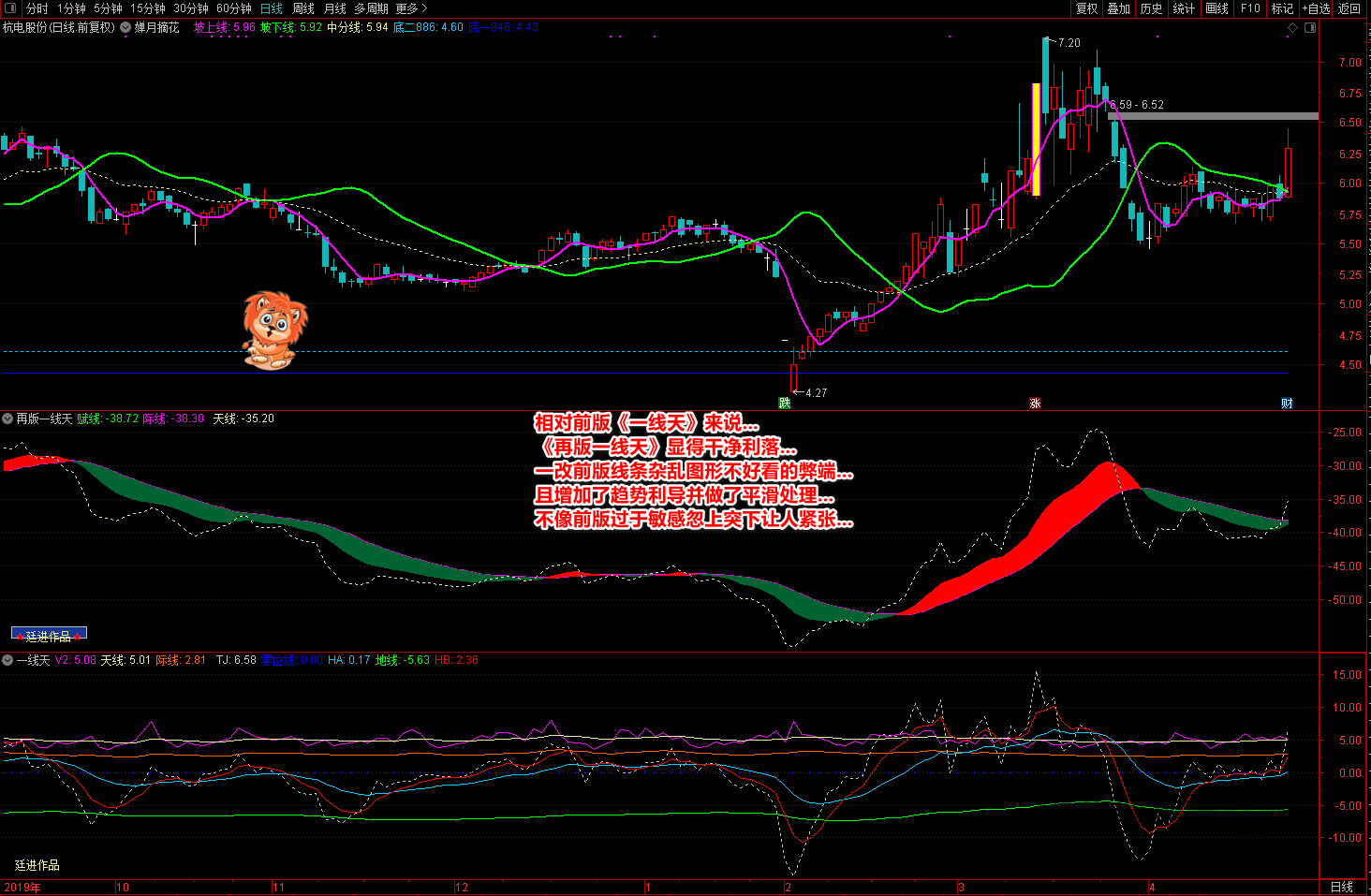 《再版一线天》副图指标也是应同学的一再要求重新编写的,可以说在去年9月份编写的前版《一线天》基础上重新调整了思路,使得此副图指标一改前版《一线天》线条杂乱、无法显示趋势的弊端,使得《再版一线天》显得线条简洁漂亮,还具有趋势利导作用,可以说在性能方面是一个极大的提升。加入的红绿色带使得你在把握和分析个股走势上更加有信心和有把握,也明白的让你知道在什么时段可以进,什么时段可以出,同时也极大的避免了前版《一线天》信号过于频繁的毛病,使掌握指标的同学可以得心应手,让你对个股的操作不再盲目无助。