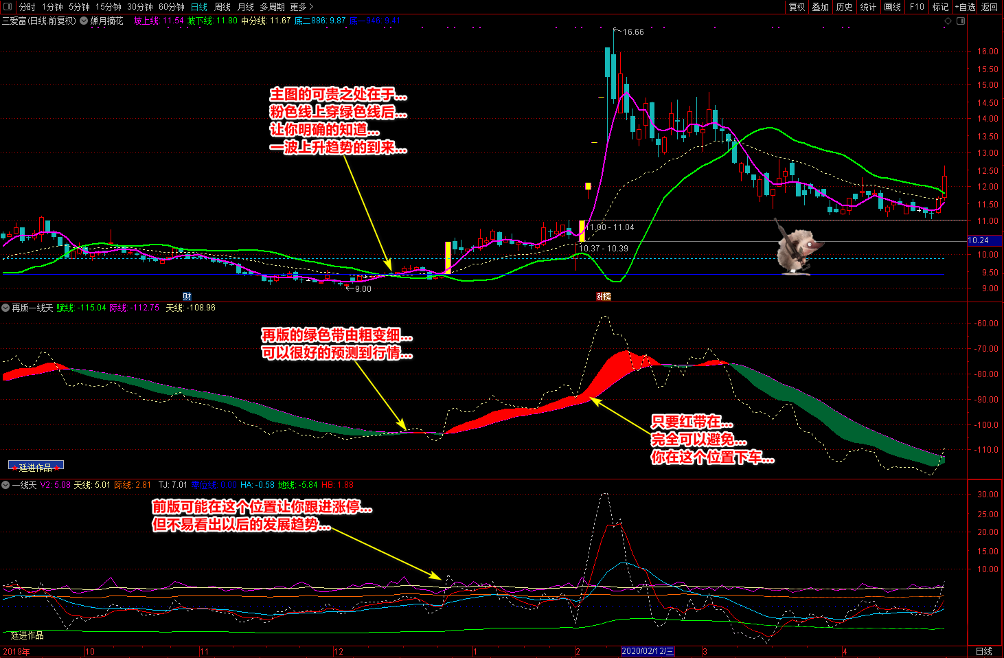 此套指标包括一个《婵月摘花》主图和一个《再版一线天》副图、以及两个自动选股指标构成。在编写之初就力求能够达到两个指标前呼后应,相互映照的效果。经测试完成后的这套指标在某些关键点上的配合可谓天衣无缝,达到了预期效果,可以最大限度的把大家紧张费神的精力解放出来,而且做到了准确明了。因不掺杂任何未来函数,所以所有信号不会产生漂移和失真,可以说给股民和小散带来了福音。