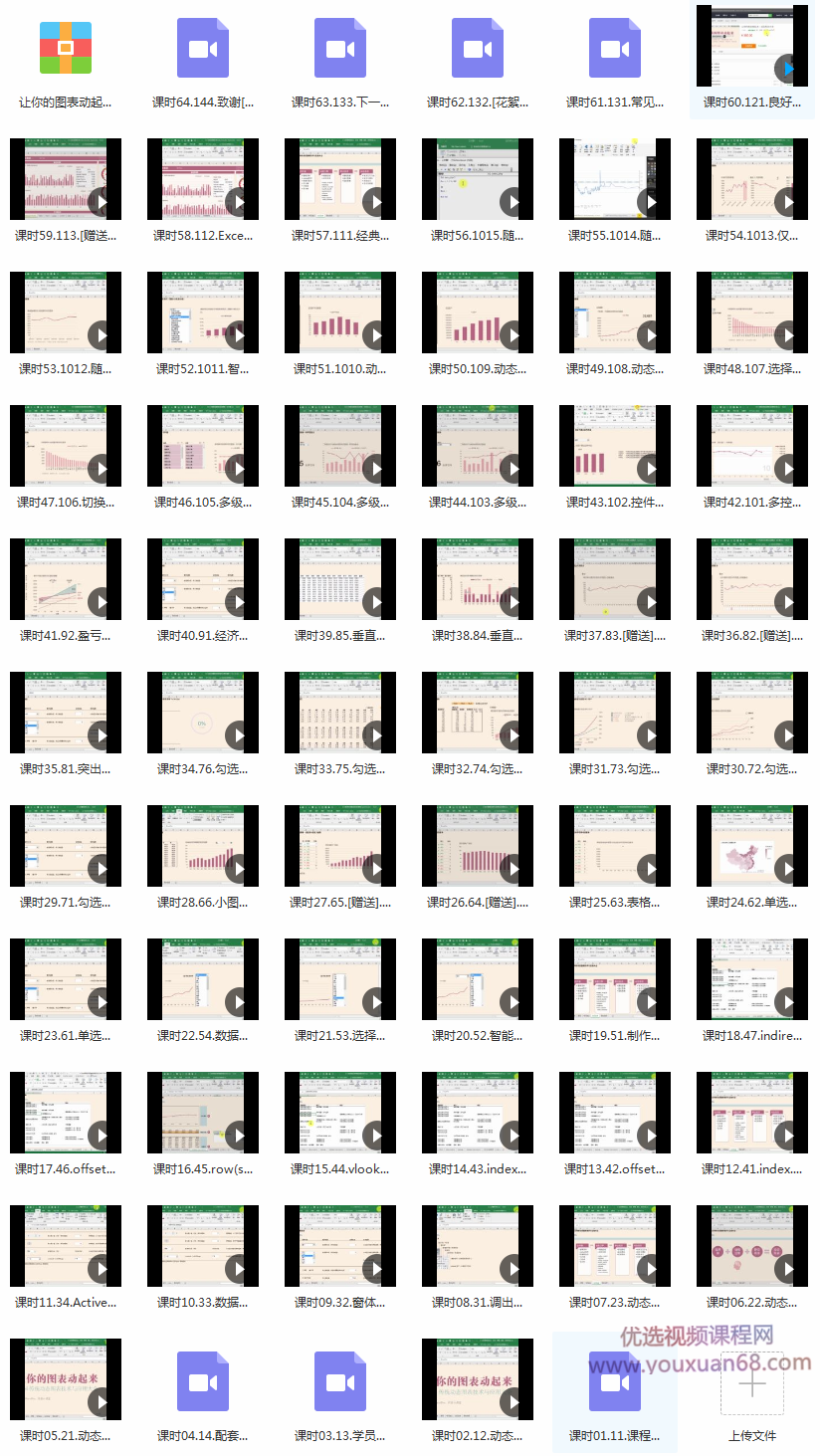 课程由浅入深,在导入了动态图表的原理机制、常见做法后,分别介绍了选择器、抽数引擎的构造方法,然后分类介绍了各种控件动态图表的运用形式,介绍了大量的综合运用范例,最后介绍了一个综合性的动态仪表板模型的实现,甚至介绍了如何在 PPT 里动态演示。