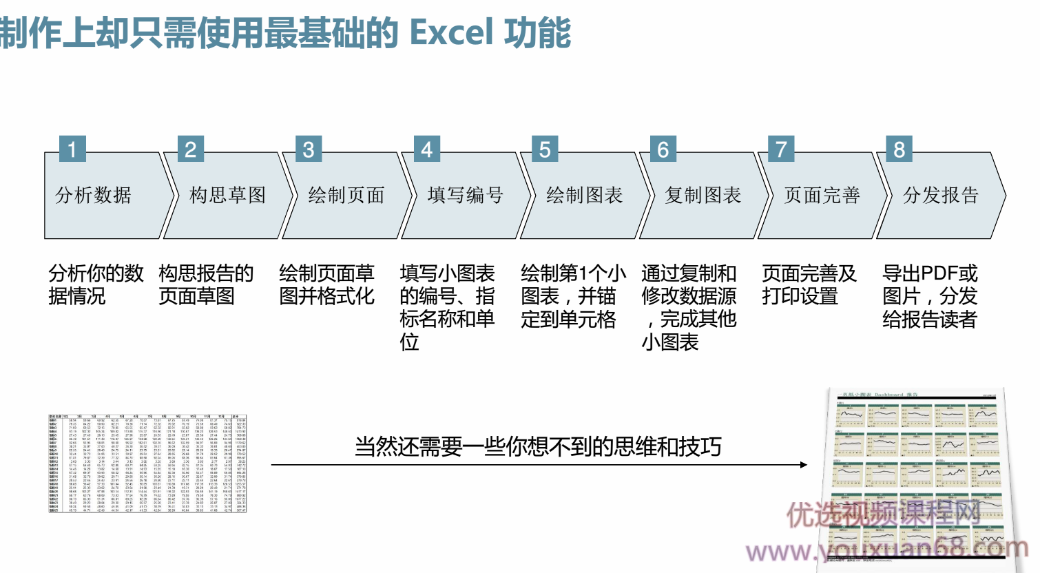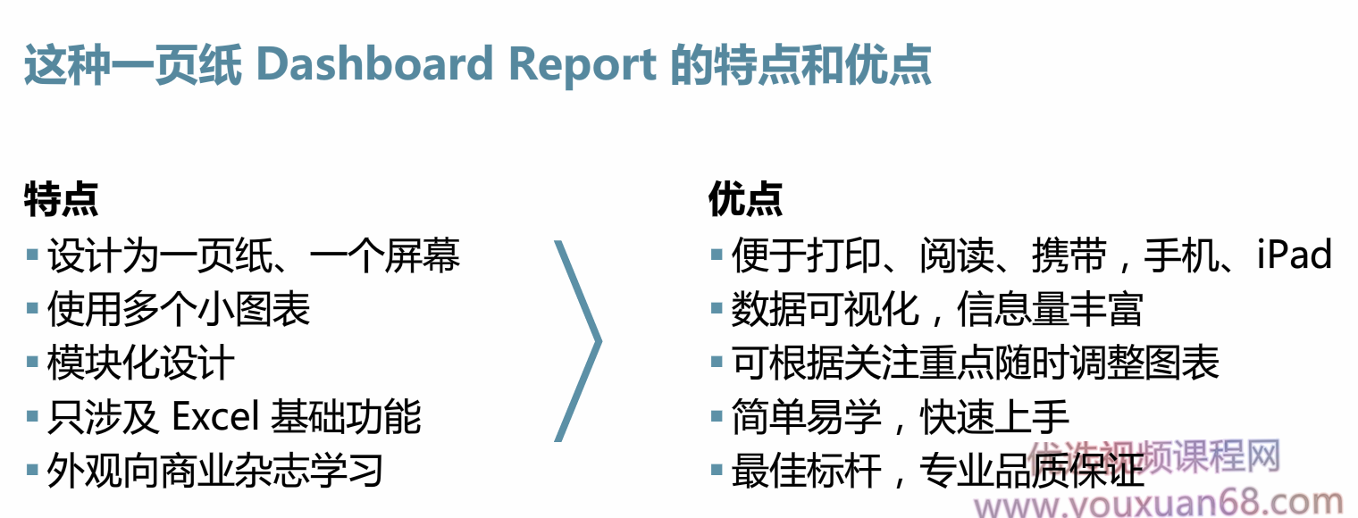 本课程告诉你,如何把月报表做成图文并茂、具有商业杂志专业范的一页纸报告(Excel Dashboard Report),可打印为A4纸随身携带,发送到手机、iPad随时查看,让老板对你刮目相看!