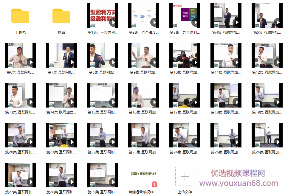 课程内容从互联网+商业变革与思维转型,转型的盈利方式升级盈利的能力开始讲起,六个维度升级,三大市场包括消费市场、创业市场、资本市场,三大盈利空间包括产品服务(利润)、模式商机(赋能)、股权融资(金融),九大盈利运营能力:团队运营、资源运营、价值运营、客户运营、渠道运营、多元化盈利、引流运营以及互利一下体系等等的共29节。