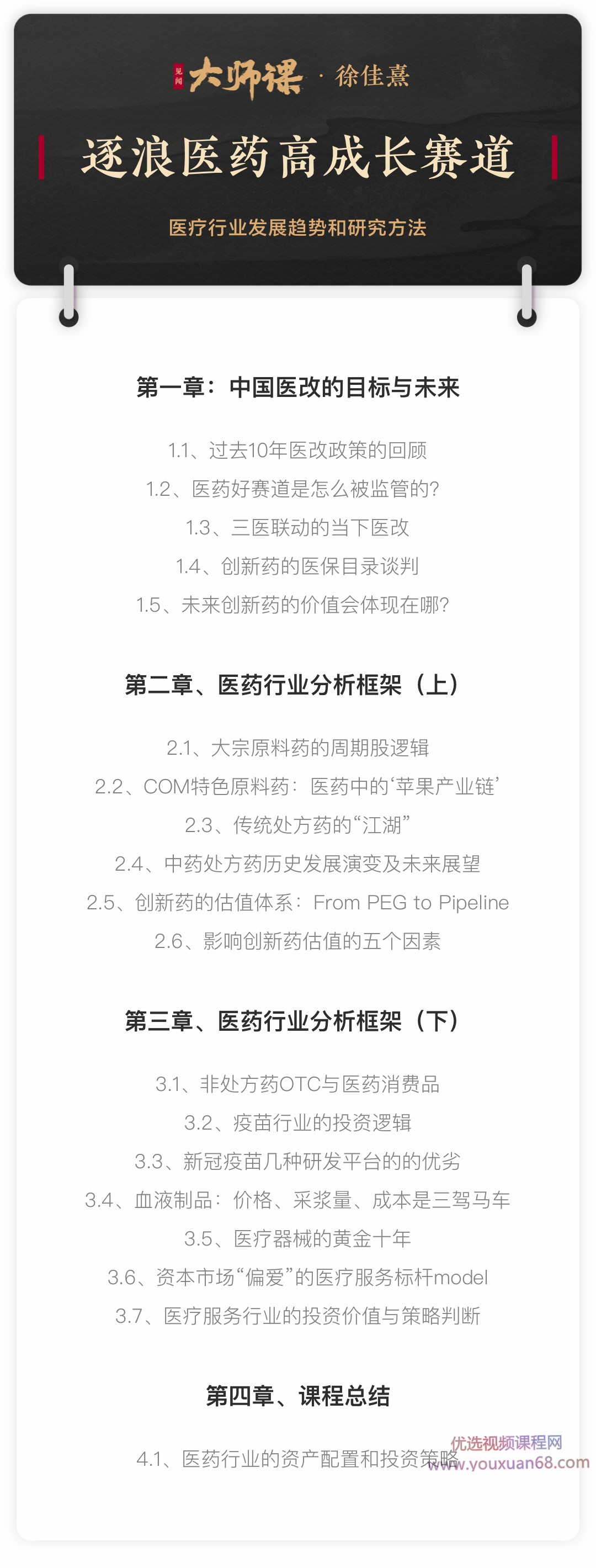 本次华尔街见闻大师课从“医药行业的发展趋势和研究方法”的核心议题出发,邀请2016-2019新财富医药四连冠分析师徐佳熹博士,从宏观政策到细分领域,从研究框架到估值体系,系统梳理医药行业的底层逻辑和未来展望 。