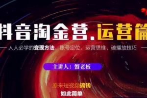课程来自蟹老板的抖音淘金营,运营篇。人人必学的变现方法,主要内容包括:账号定位、运营思维、破播放技巧等,原来短视频搞钱如此简单。