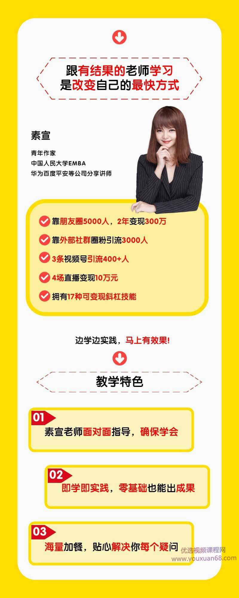 课程教你流量源源不断的秘诀,轻松月入10万,课程从做好产品3要素开始讲起:产品定位、产品透、产品矩阵,好产品不如好故事,做好故事机制、故事场景、故事模板让好故事自己会传播,搞销售力朋友圈都具备的两个特点:成交原理、IP打造塑造个人IP唤起目标客户付费欲望,精准聚焦、高效方法、实战演练3个套路,写出朋友圈杀手营销文案加上”点石成金”营销话术,成交率翻三番,自建社群营销变现力提高10倍的秘诀,吧别人的社群,变成自建的引流池,激活社群沉睡会员,营收翻番。