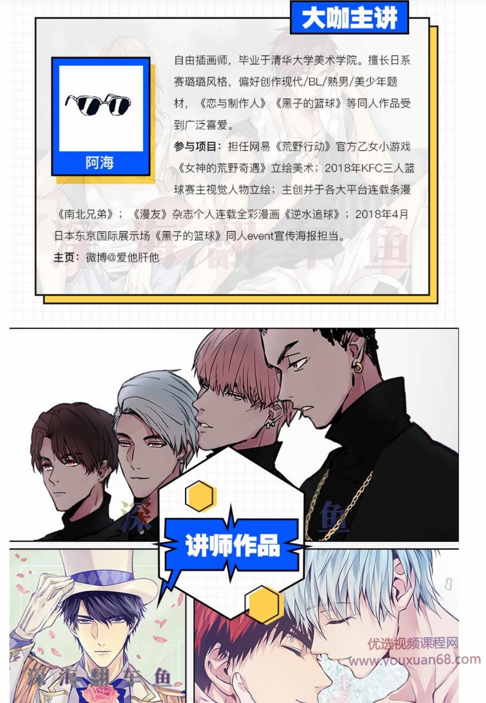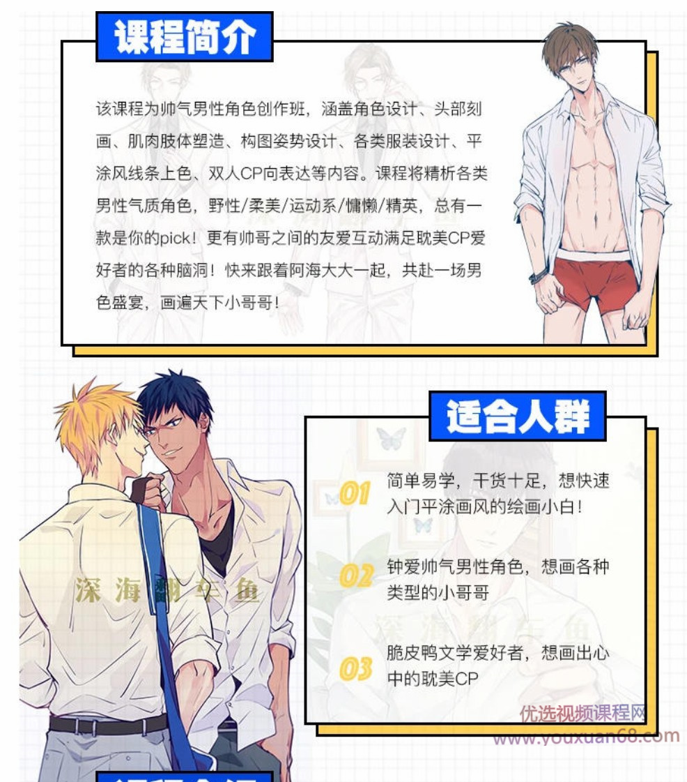 该课程为帅气男性角色创作班,涵盖角色设计、头部刻画、肌肉肢体塑造、构图姿势设计、各类服装设计、平涂风线条上色、双人CP向表达等内容。课程将精析各类男性气质角色,野性/柔美/运动系/慵懒/精英,总有一款是你的pick!更有帅哥之间的友爱互动满足耽美CP爱好者的各种脑洞!快来跟着阿海大大一起,共赴一场男色盛宴,画遍天下小哥哥!