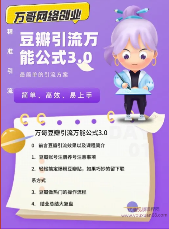 豆瓣引流相信在很多平台上都看过类似的课程,万哥这套课程完全是通过自己的实战所总结出的一套独特的方法与技巧