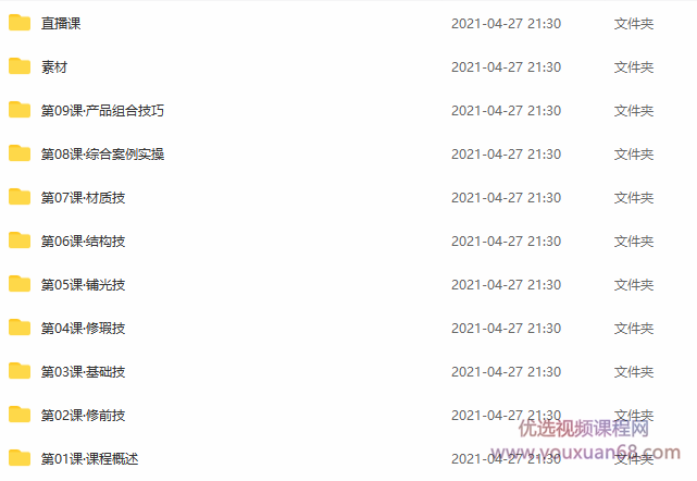 产品修图有别于人像修图,除了需要体现美感,气氛,品质感这些软功以外,还需要体现出品类调性、材质属性、结构特性等等。我见你们骨骼惊奇,分享一套理念与技法相结合,系统+全面+深入+实效的产品精修视频课程给你。