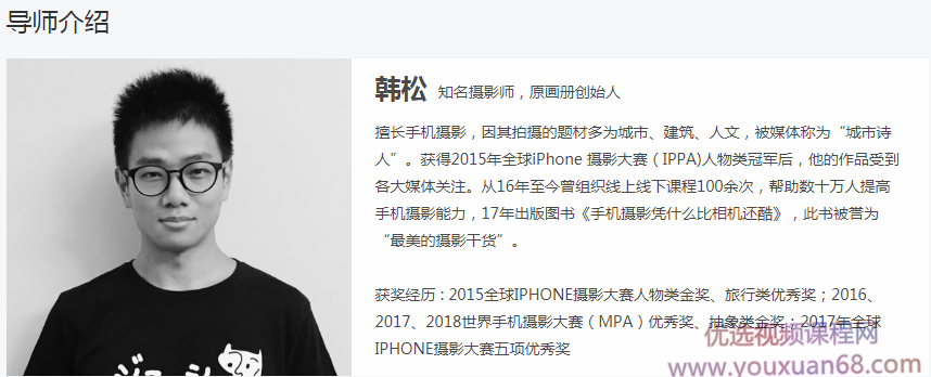 本课程由全球iPhone摄影大赛人物类冠军得主韩松主讲,是一套全新的手机摄影系统课程,从入门到精通,从创意到创作,全系教学。共十个章节、30课时的内容