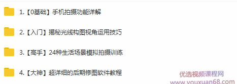 「新片场学院」明星御用摄影师40节课教你成为手机摄影高手,4大模块,40节精美视频,从认识相机到构图、用光、取景再到后期修图,在这里,你能学会所有“拍好照片”的核心技术。0基础的爷爷奶奶学起来也毫无压力,拒绝一切专业术语,用简单的语言拆解手机摄影的思路和步骤,简单实用接地气。28年专业摄影经验总结,不仅教你拍好照片,还能教你锻炼“摄影眼”;课程采取问答形式,大树老师根据每位学员关心的内容,解决痛点快、准、狠。