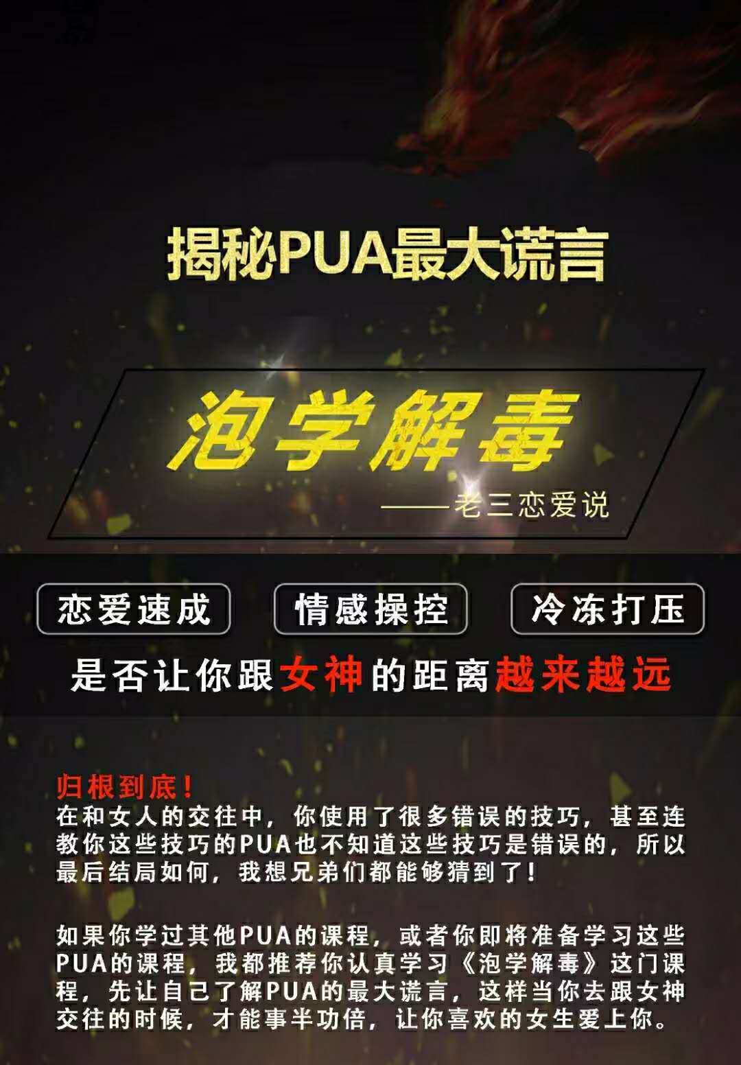 如果你学过其他PUA的课程,或者你即将准备学习这些PUA的课程,我都推荐你认真学习《泡学解毒》这门课程,先让自己了解PUA的最大谎言,这样当你去跟女神交往的时候,才能事半功倍,让你喜欢的女生爱上你。