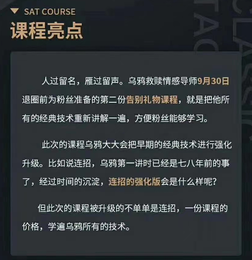 人过留名,雁过留声。乌鸦救赎情感导师9月30日退圈前为粉丝准备的第二份告别礼物课程,就是把他所有的经典技术重新讲解一遍,方便粉丝能够学习。