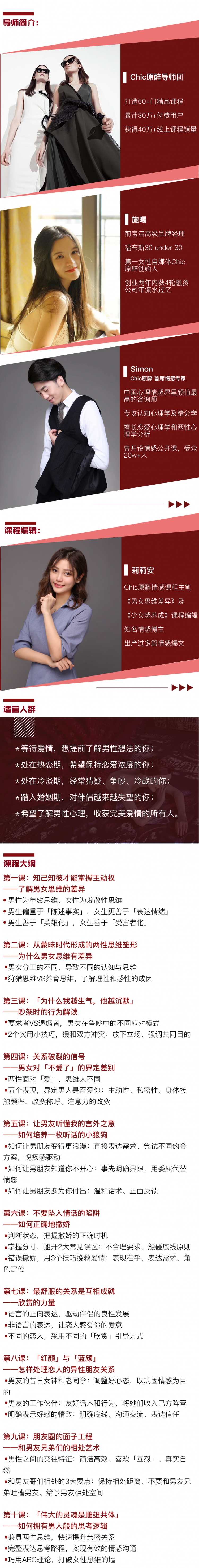 学完10节课后,你将得到大量实用技巧,解决两性中的各种问题,最终成为一个“完美爱情”的高手。只要多付出一点点,就可以轻松赢得一段最甜蜜的关系。爱情中,还有比这个更划算的事么?