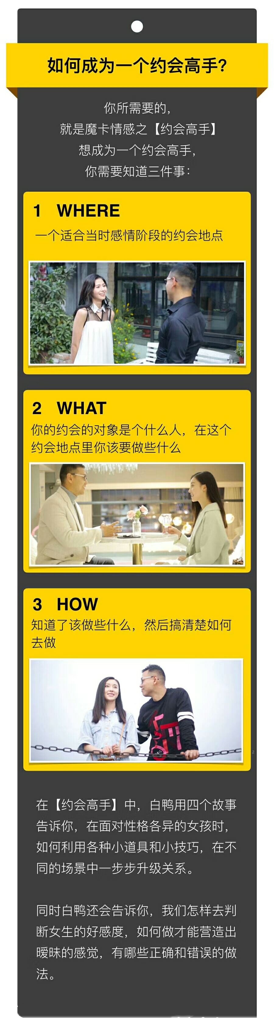 魔卡白鸭《约会高手》课程中,白鸭用四个故事告诉你,在面对性格各异的女孩时,如何利用各种小技巧小道具,在不同的场景下一步步升级关系