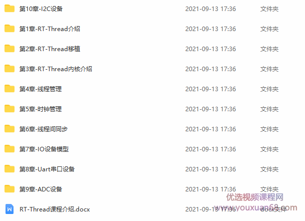 RT-Thread精品课程包含:系统移植、内核介绍、线程管理、时钟管理、线程同步、设备使用等RT-Thread核心内容,让想学习和使用实时操作系统的同学更加方便和快捷的学习到实时操作系统的操作和使用