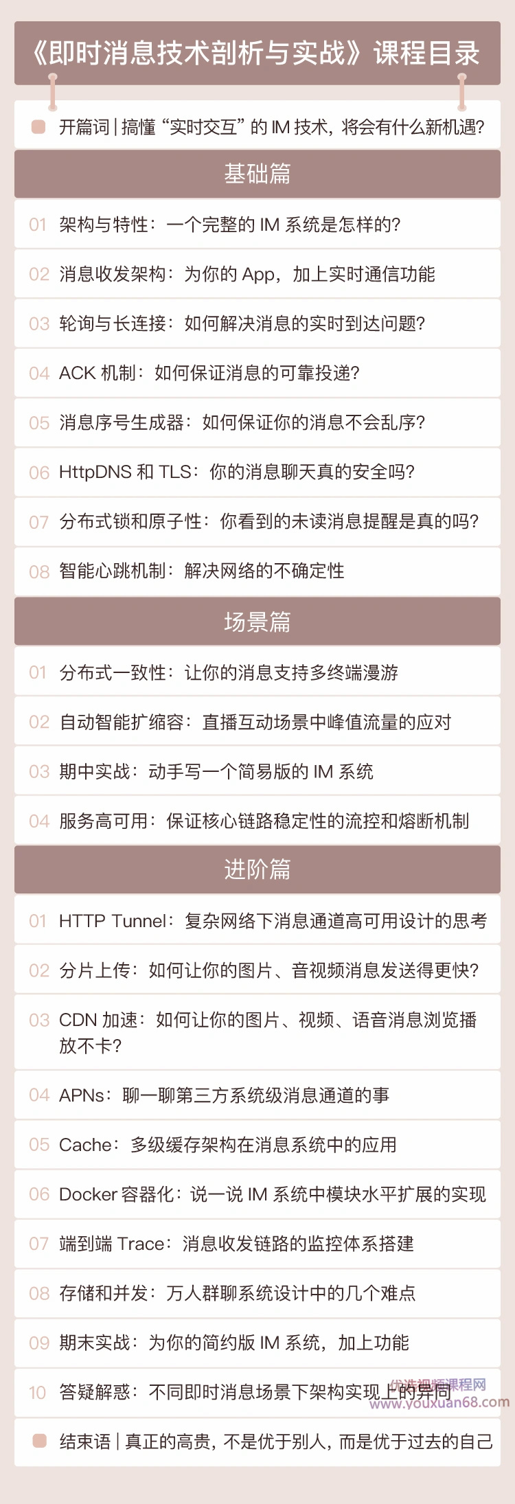 场景篇:在场景篇里,会挑选IM技术中几个常见的具体垂直应用场景,这些场景在其特性的技术实现上有一定的挑战,课程会针对比较核心的重点和难点来进行拆分讲解。比如消息的多终端漫游功能的实现重点,直播互动场景中峰值流量的应对等等。