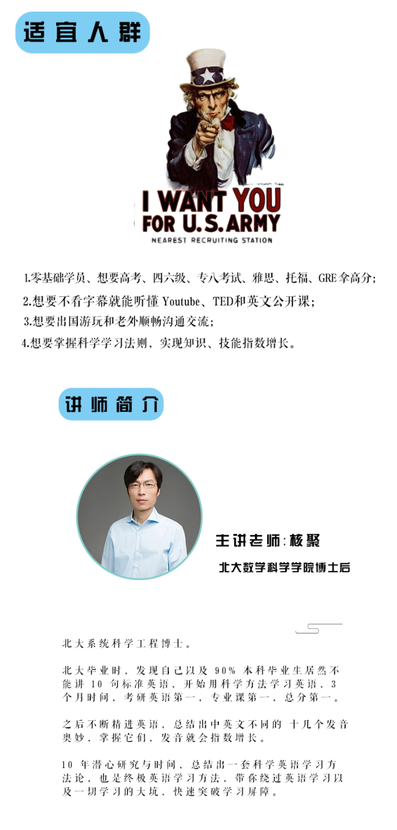 1.零基础学员、想要高考、四六级、专八考试、雅思、托福、GRE拿高分;