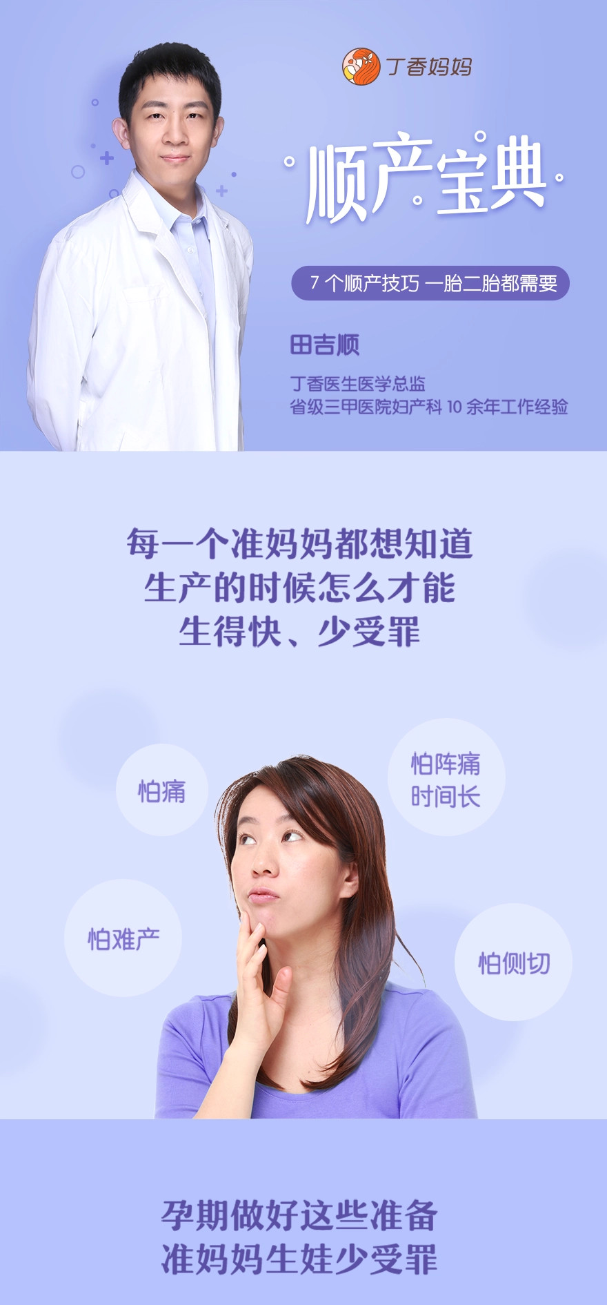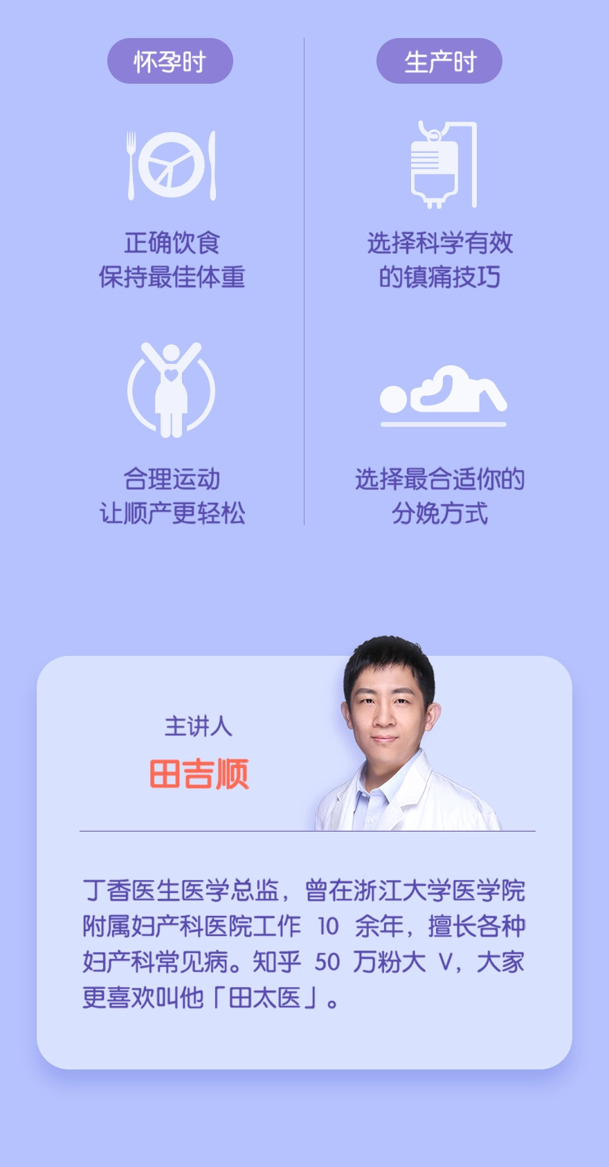 如何让宝宝健康,同时让妈妈安全、轻松地生产呢?丁香妈妈和省级三甲医院妇产科 10 余年工作经验的田太医一起,精心准备了一套「顺产宝典」的课程。