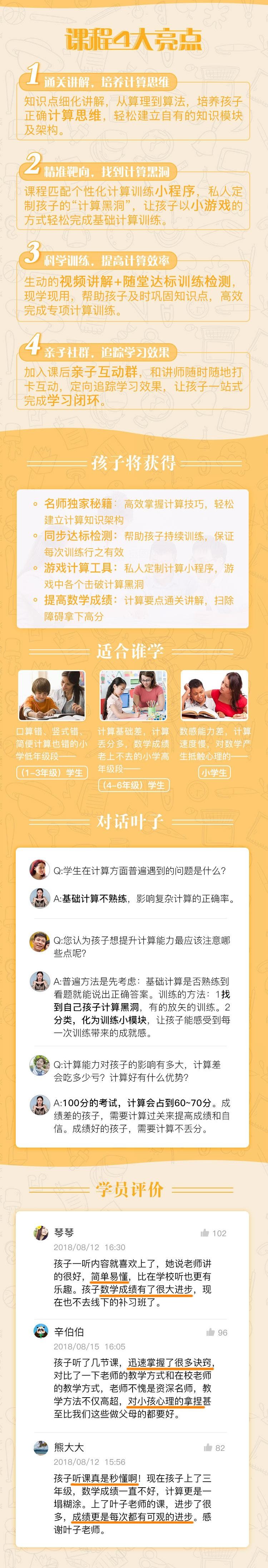 计算是数学学习的基础——小学阶段100分的试卷,计算占60-70分。 计算慢还出错,不是孩子粗心,而是孩子没掌握科学的计算方法。叶子老师给你带来《小学数学计算全攻略》涵盖小学1-6年级的所有计算知识点,让孩子在科学的训练方法下,轻松解决基础计算,掌握高效的计算技巧,攻克数学计算,提高学习成绩。