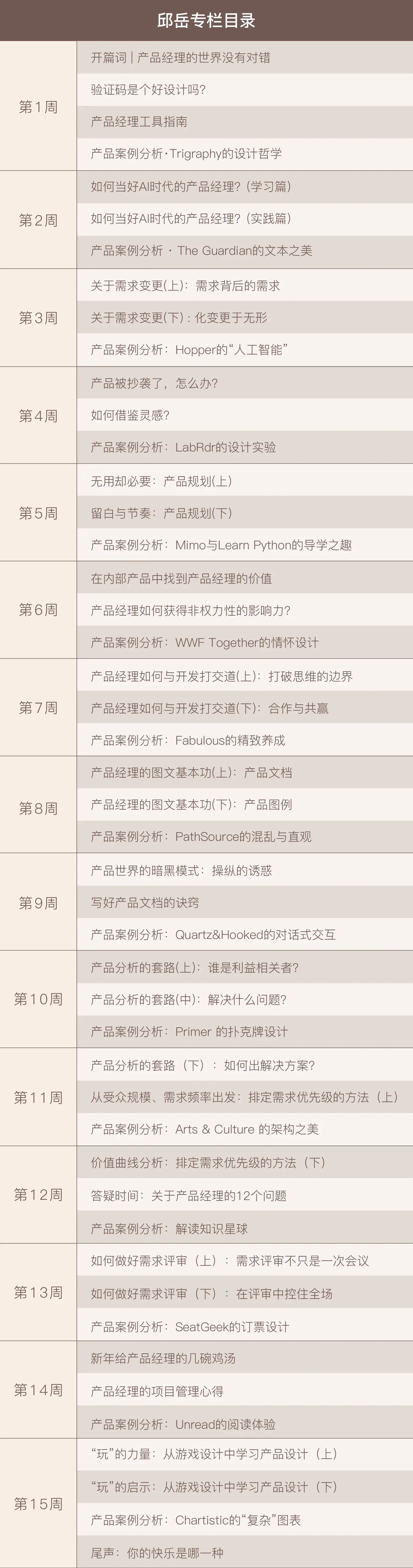 这篇文章中,邱岳将第一次把产品经理作为主题,把自己见过的、想的、想的一笔带过地写出来,他希望自己的经历和思考能够给读者带来启发,促使每个人跳出固有的思维框架,重新审视自己的作品,从而获得成长。