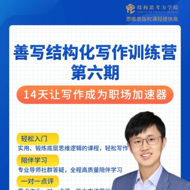 《结构化写作训练营》我们希望教给大家的是:’底层逻辑’,是科学地学习一门新知识和新技能的系统方法,是解决问题的能力,而不仅仅是写作本身!让你在职场上,放大你的工作成果;在生活中,记录你的美好生活。
