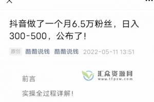 课程来自于 酷酷说钱:抖音做了一个月6.5万粉丝,日入300-500