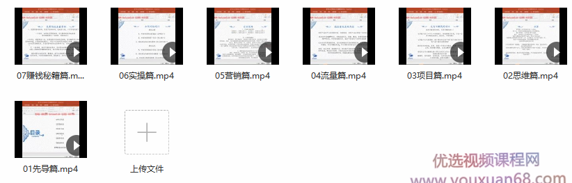 这套课程一共分为“先导篇”、“思维篇”、“项目篇”、“流量篇”、“营销篇”、“实操篇”、“赚钱秘籍篇”。通过七个章节的讲解,帮助小白零基础快速打通赚钱任督二脉!