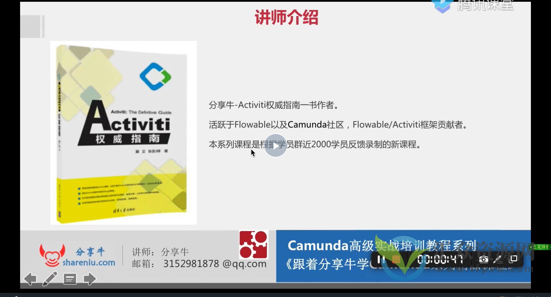 这是一个关于Camunda高级实战培训系列教程的介绍。这个教程提供了许多有关Camunda的视频和文档,包括Camunda的介绍、快速入门导航、官网介绍、论坛介绍、程序包下载、程序包目录结构说明、程序包项目说明、工作流4个项目的完整流程、管理员模块使用以及授权说明、请假流程实战导航、请假流程绘制、Modeler设计器说明、流程启动以及tasklist模块演示、Cockpit以及tasklist模块演示、过滤器使用以及实例挂起激活、内存数据存放的文件说明、数据源修改为MySQL实战、Camunda引擎类以及引擎配置类、搭建项目获取引擎以及服务类、日志配置、服务类职责以及实例化源码分析、常用数据约定以及相关类继承、引擎类以及服务类初始化源码、获取Spring容器Bean原理、流程引擎构造源码以及DDL脚本、historyLevel使用以及锁表演示、引擎启动必要性检查、流程引擎管理类获取演示、流程引擎插件原理分析以及使用、手工创建流程引擎3种方式、标准版流程引擎类扩展思路、Spring整合Camunda、自动部署使用、Spring风格流程引擎扩展、Camunda引擎DB类型优化点、创建用户两种方式以及密码加密、用户列表查询以及过滤条件添加、分页语法以及使用、用户删除、组CRUD以及组与用户建立关系、租户下面添加人-组以及查询、用户信息CRUD操作、人员组织6张表说明、资源与权限码说明、查询以及新增用户权限、给用户授权访问多个资源的权限、给用户授权访问操作组等权限、授权用户操作Cockpit项目、RuntimeService以及派生类、执行实例流程三个景点案例、流程实例启动涉及到的表说明、从任意节点启动实例、历史数据五张表说明以及跟踪实例、流程启动人以及initiator设置、流程实例单删除以及批量同步删除、流程实例启动核心源码查看、流程实例以及定义挂起激活操作、开始结束节点说明、userTask处理人两种定义方式、任务**器使用、组任务设置以及演示、组任务处理人三种设置方式、任务处理人动态添加以及移除、角色使用、过滤器各种场景使用、过滤器注意事项、表单声明周期-定义方式、外置表单问题以及解决、外置表单常见问题、外置表单StartFormData获取、查询渲染表单并提交任务、动态表单定义以及信息获取、自定义表单引擎思路、节点任意批跳转、实例批量挂起激活、历史实例复活、历史实例批量删除等。