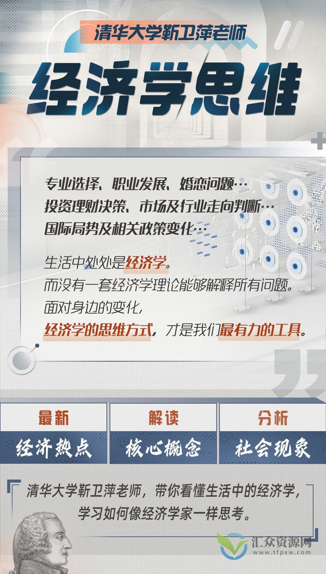 清华大学全校TOP5%热门课堂,本系列课程结合最新社会现象以及经济议题,对内容框架及案例进行了全面更新升级,刨除复杂的公式图表,筛选关键经济学概念及其应用,让每个人都能听得懂、用得上。