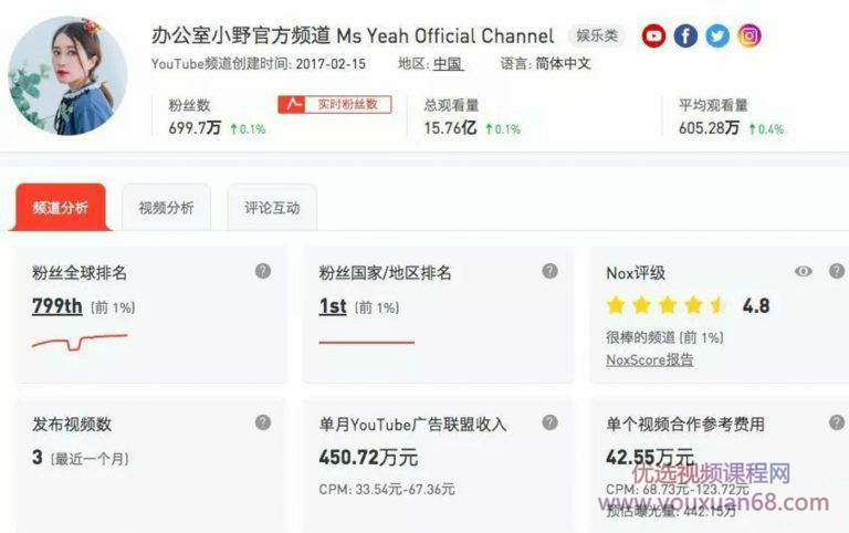 国内自媒体《办公室小野》YouTube单月广告分成450万,登录华人Youtuber榜首,可是其全球排名仅为799名,中国自媒体在YouTube潜力巨大!