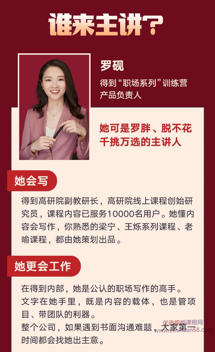 而罗砚老师也是为数不多能一直在罗老师和脱不花身后的那位,帮助他们把梦想变成现实、把他们的每一个决策变成对的事儿,正应了“是金子都会发光”的原理,她是继脱不花、罗振宇之后第三个能被罗胖点头立项开写作训练营的人,而其实力必然早远超你我认知!