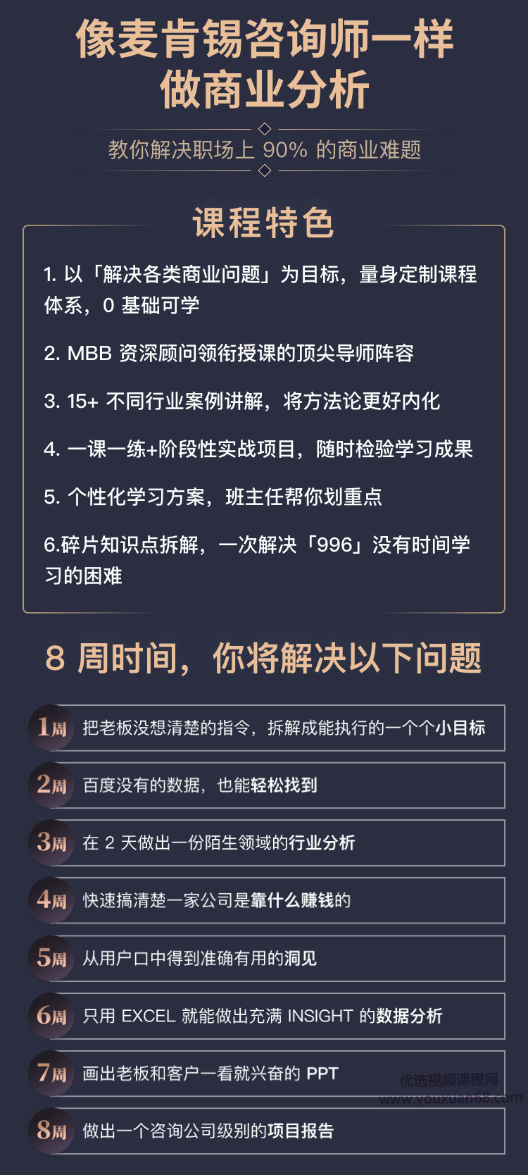 课程让你在较短的时间经历高水平的商业分析全流程,帮助商业分析能力的养成,提升职场上非常实用的问题解决能力。